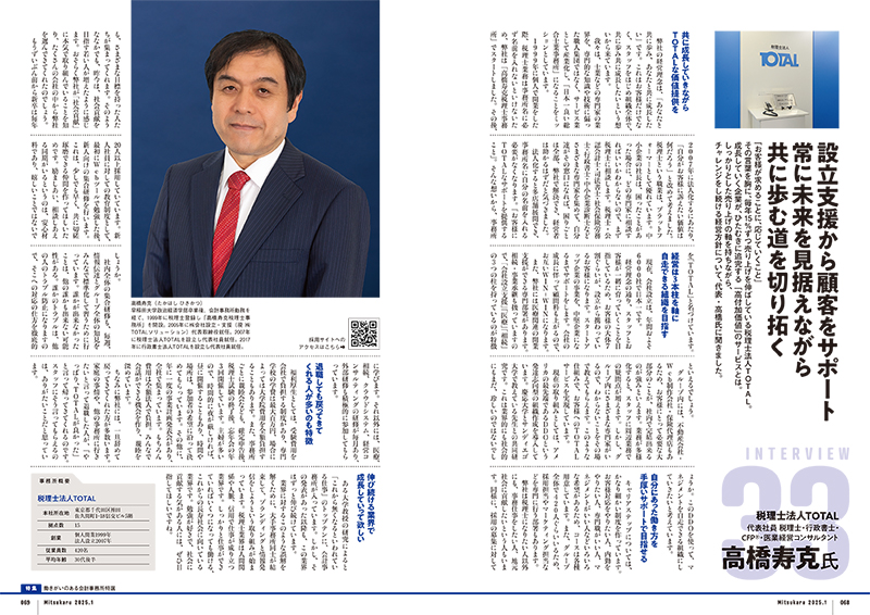 「税理士業界で働く人のための専門リクルートマガジン 働きがいのある会計事務所特選vol.1」にTOTALグループ代表 高橋寿克のインタビューが掲載されています。